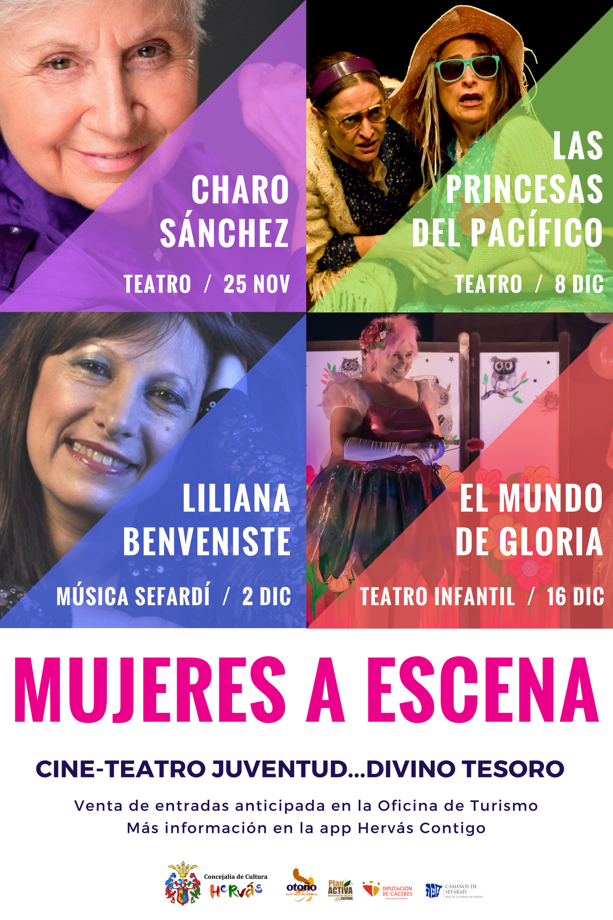 El Ayuntamiento de Hervás, a través de la Concejalía de Cultura, propone para este final de otoño un ciclo de teatro y música titulado ‘Mujeres a escena' con actuaciones protagonizadas todas ellas por mujeres. Con este ciclo se vuelve a llenar el Cine-Teatro Juventud de propuestas culturales, además de las ya existentes, y tiene vocación de marcar una línea de programación basada en ciclos temáticos que tenga continuidad el año que viene.
